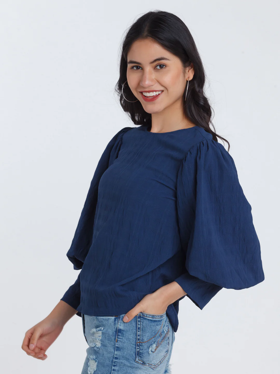 - Description : Navy Blue Puff Sleeve Top For Women