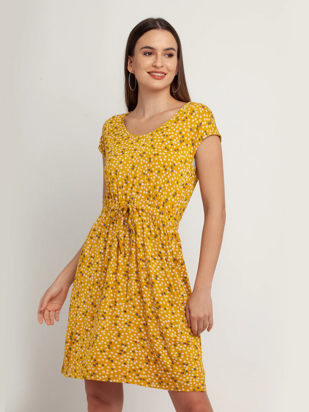 - Description : Yellow Solid Short Sleeves Short Dress For Women